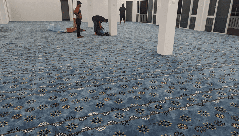 Tim Nusantara Karpet Sdn Bhd melaksanakan proses pemasangan dengan penuh dedikasi bagi memastikan hasil yang cukup kemas dan tanpa cacat cela. Penggunaan teknologi laser dalam penjajaran saf menjamin barisan jemaah yang sentiasa lurus, mencerminkan kualiti kerja profesional yang menjadi kebanggaan setiap klien kami.