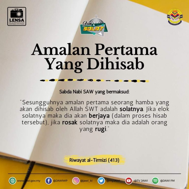 “Amalan yang pertama kali dihisab dari seorang hamba pada hari kiamat adalah solatnya.” (Riwayat Abu Daud)