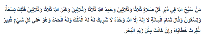 Maksudnya: “Barang siapa bertasbih kepada Allah selepas solat sebanyak 33 kali, dan bertahmid kepada Allah 33 kali, dan bertakbir kepada Allah 33 kali, hingga semuanya berjumlah 99,” dan baginda menambah: “Kesempurnaan 100 adalah membaca: Laa ilaaha illallah wahdahu laa syariika lahu, lahul mulku walahul walahul hamdu wahuwa ‘alaa kulli syai’in qadiir, maka kesalahannya akan diampunkan walau sebanyak buih di lautan.”