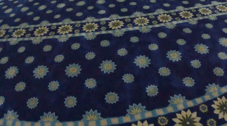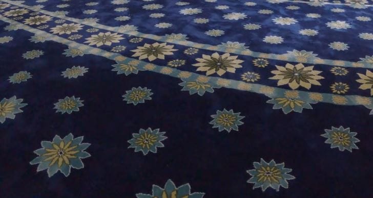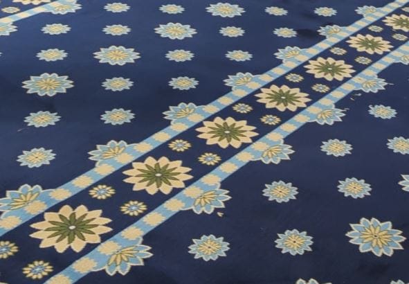 Warna biru diraja (Royal Blue) dengan corak bunga geometri kini menjadi trend popular. Pilihan di Surau Sentosa dan Prima Homes ini memberikan nafas moden kepada arkitektur dalaman surau, menjadikannya kelihatan lebih luas dan eksklusif.