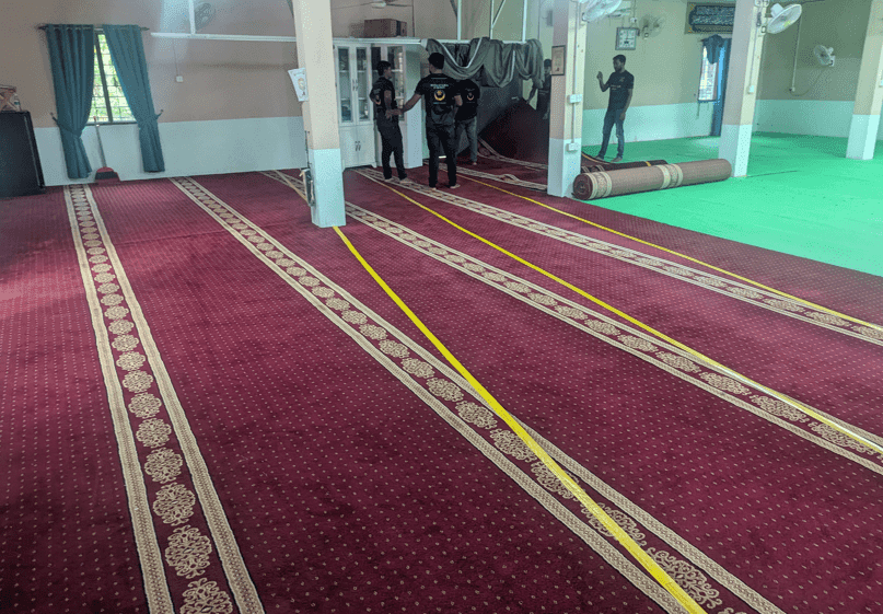 Pasukan teknikal Nusantara Carpet Sdn Bhd melaksanakan proses pemasangan dengan penuh dedikasi bagi memastikan hasil yang sangat kemas. Penggunaan teknologi laser dalam penjajaran saf menjamin barisan jemaah yang sentiasa lurus, mencerminkan kualiti kerja profesional yang menjadi kebanggaan kami.